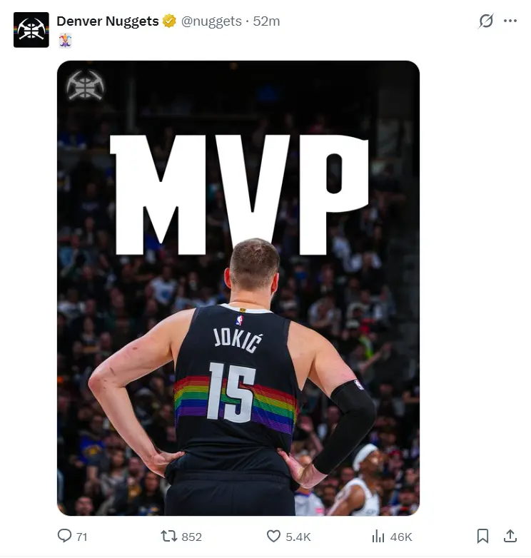 这场比赛后掘金官方晒出了约基奇的背影打上了MVP的标签,这就是掘金官方力挺的MVP。这个MVP有两层含义,第一层是本场MVP,第二层是力挺约基奇当选本赛季常规赛的MVP。