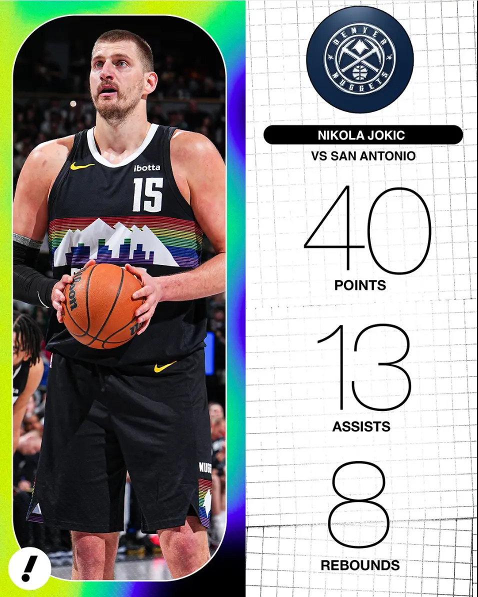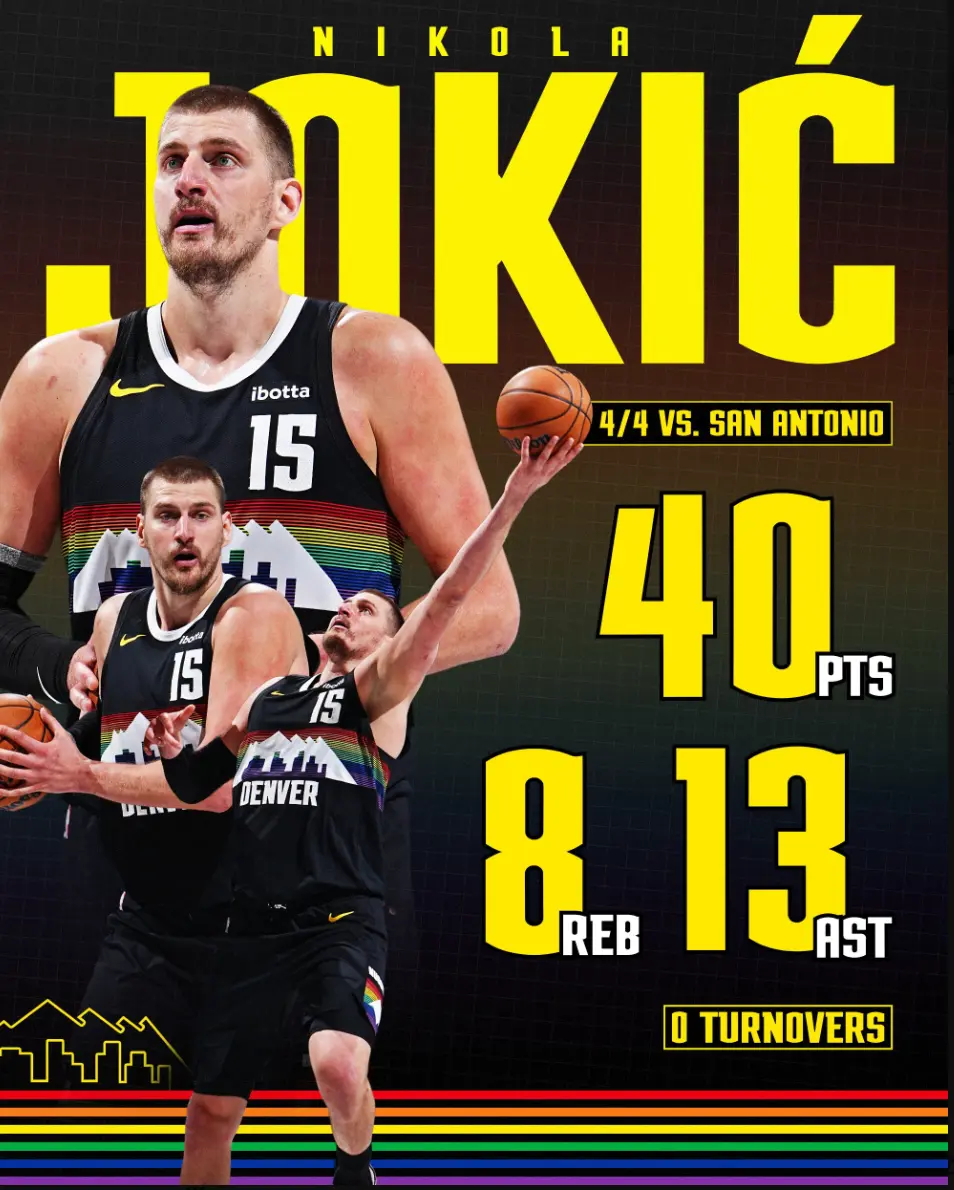 约基奇此役成为NBA历史上首位40分+10助攻+0失误的中锋,终场前9秒的决胜抛投,与终场前3秒的两罚全中都价值千金。